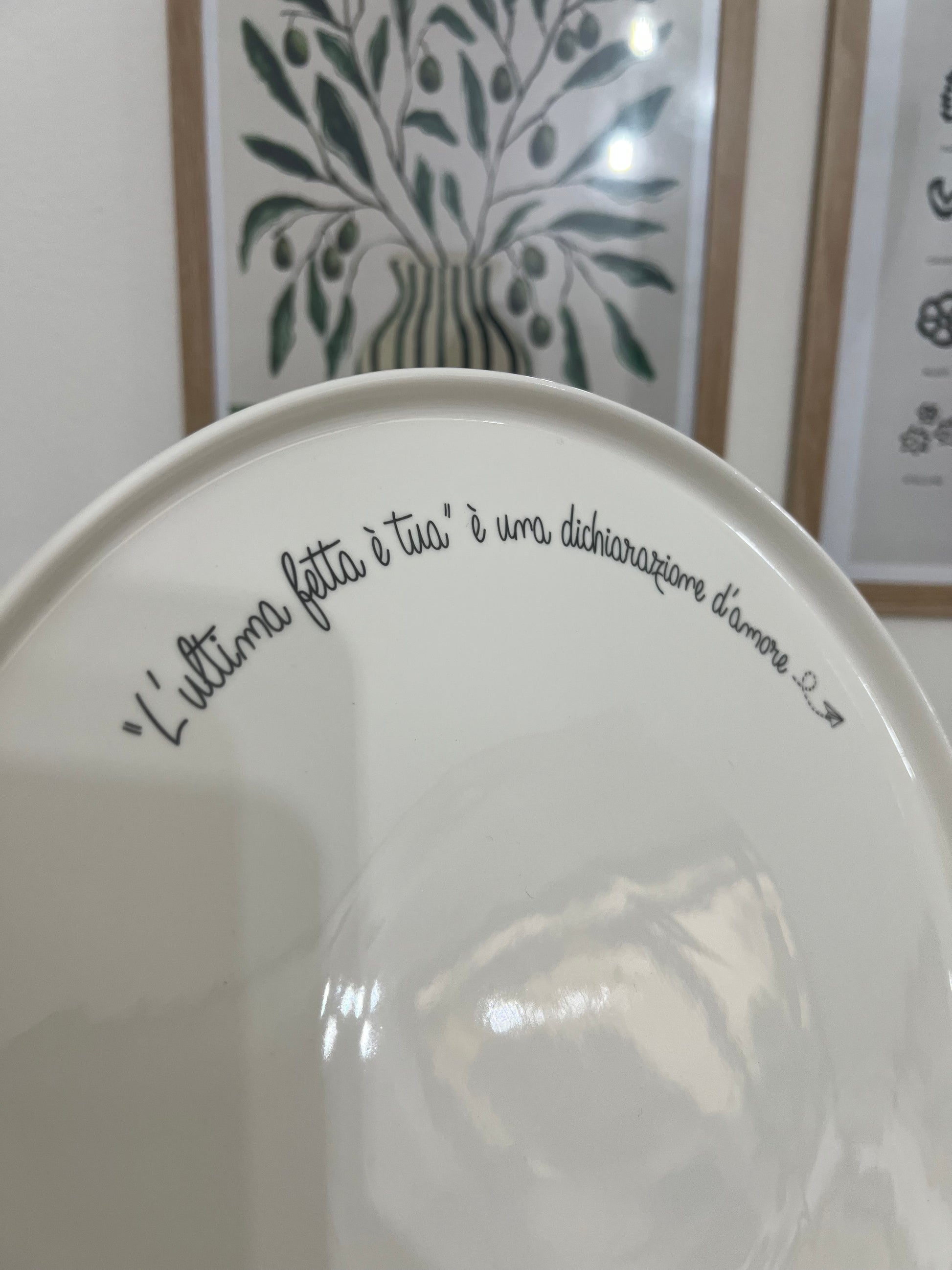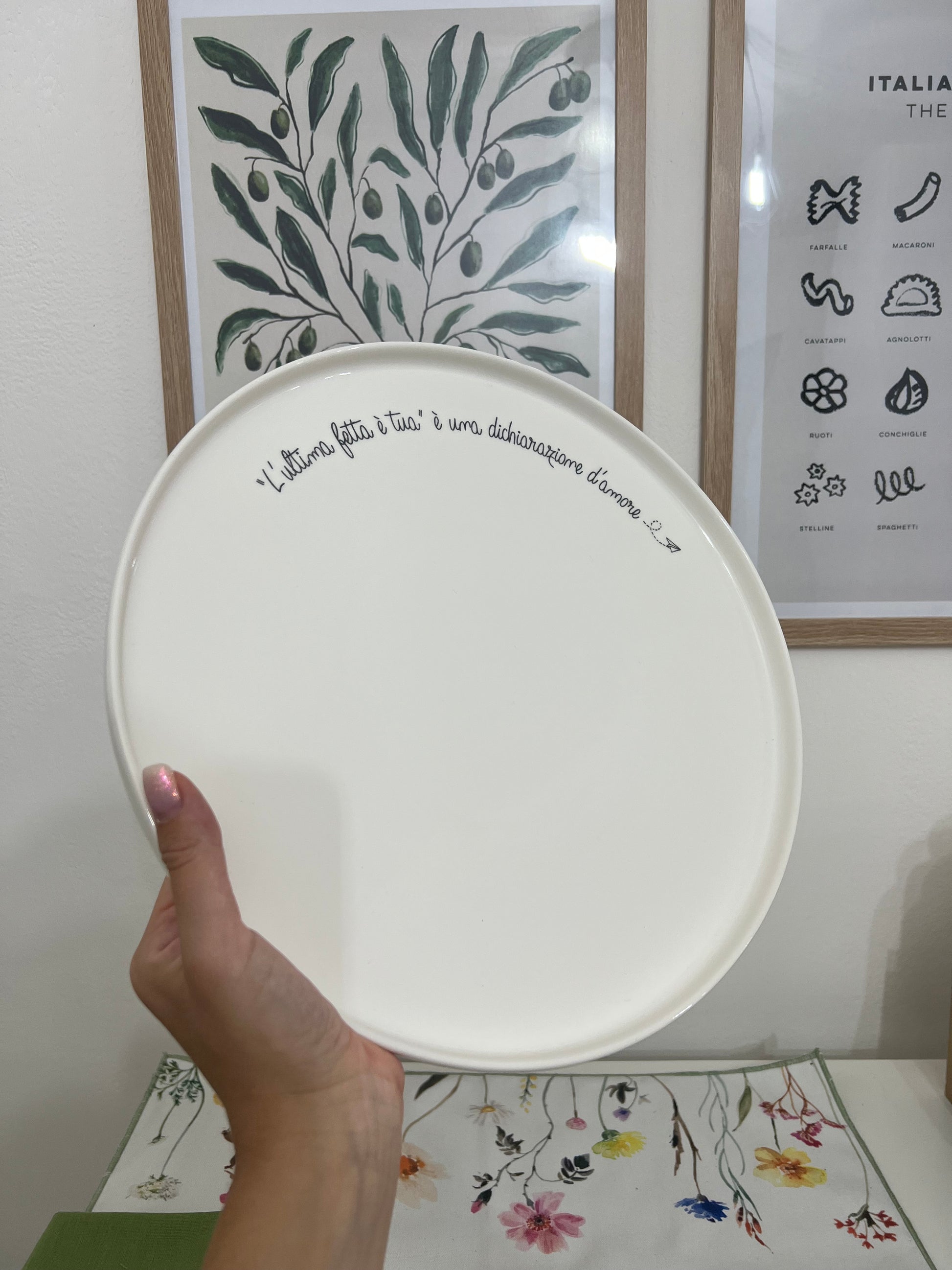 Rendi ogni pizza un momento speciale con il piatto pizza "Gli Onesti" di La Porcellana Bianca. Realizzato in porcellana di alta qualità, questo piatto da 31 cm porta la scritta "l'ultima fetta è tua" è una dichiarazione d'amore, un messaggio dolce e divertente che aggiunge calore e personalità alla tua tavola.