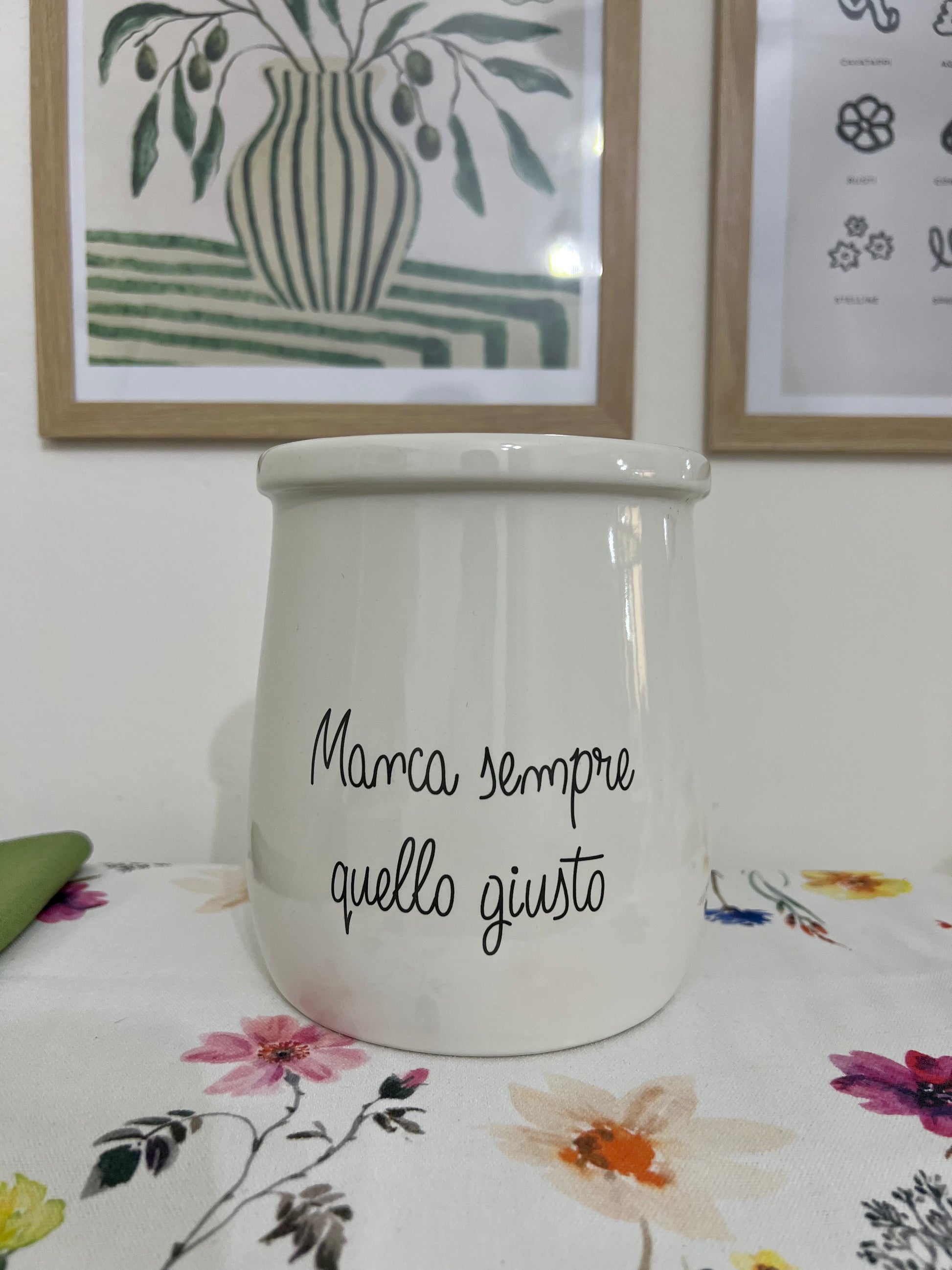 Organizza la tua cucina con un tocco di ironia grazie al porta utensili in porcellana di La Porcellana Bianca, collezione Gli Onesti. Questo pratico e raffinato accessorio è impreziosito dalla scritta "Manca sempre quello giusto", che cattura con simpatia le piccole sfide quotidiane in cucina.