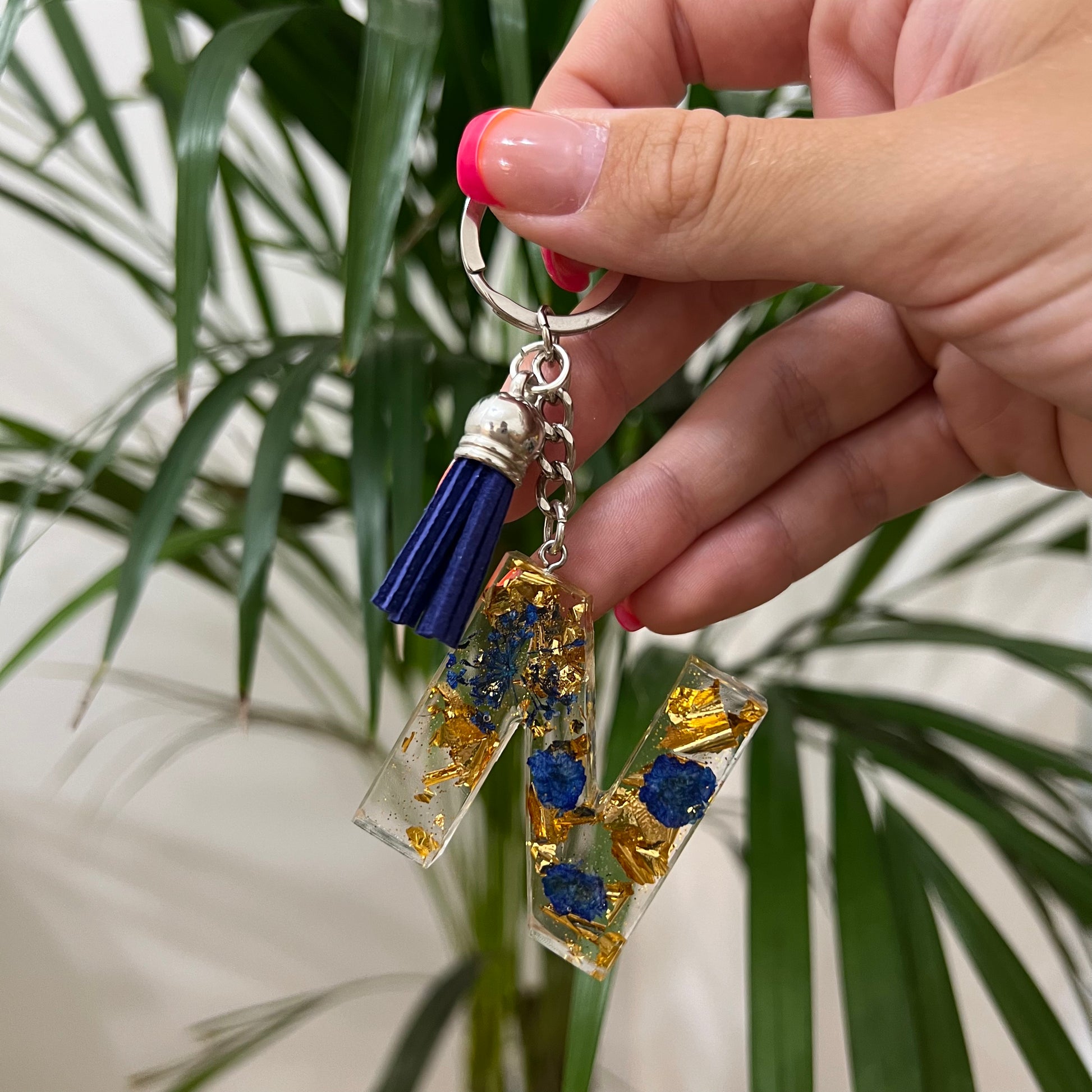 Portachiavi in resina trasparente con fiori veri essiccati.