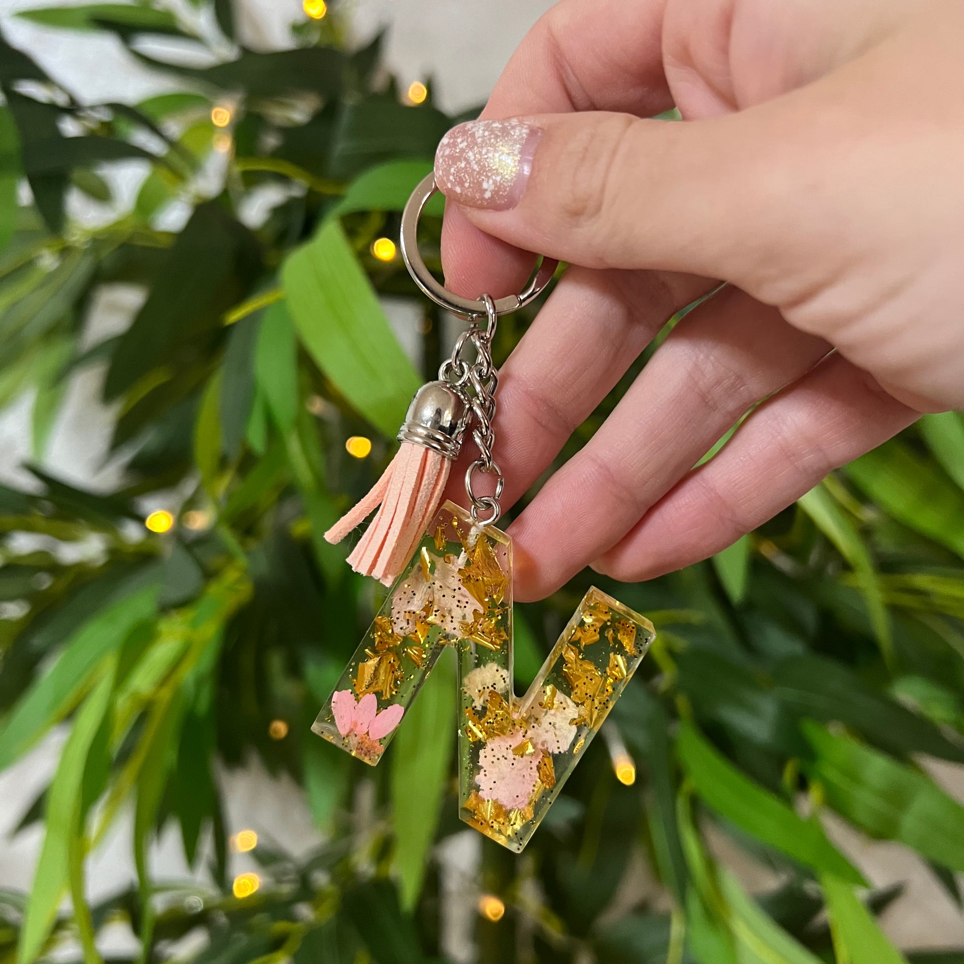 Portachiavi in resina trasparente con fiori veri essiccati.