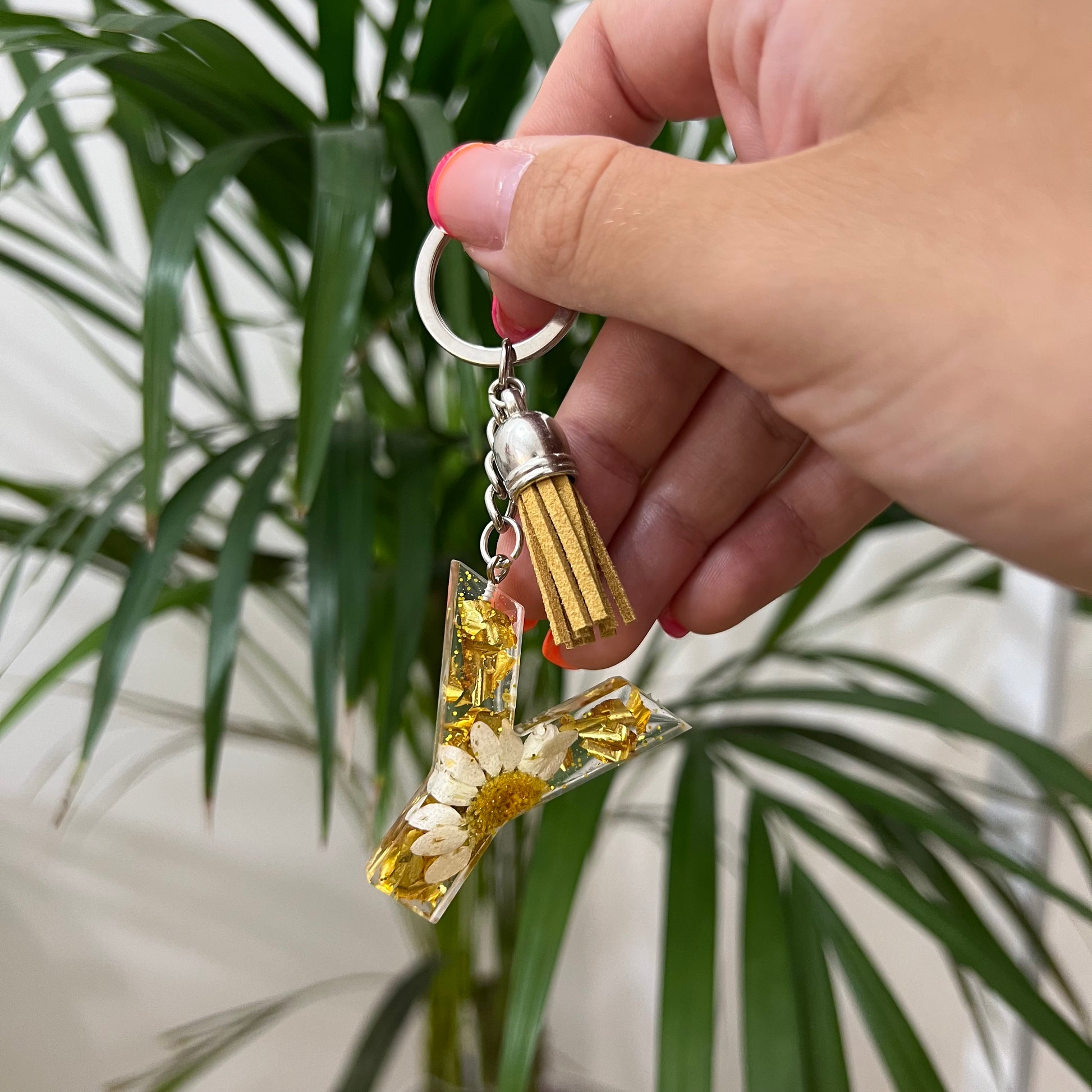 Portachiavi in resina trasparente con fiori veri essiccati.