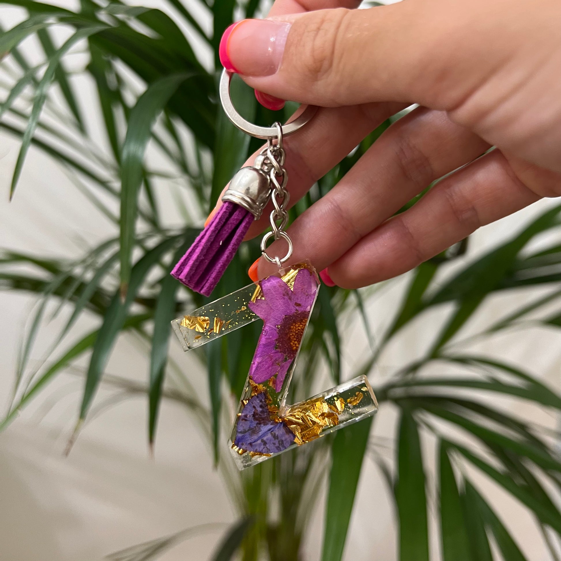 Portachiavi in resina trasparente con fiori veri essiccati.