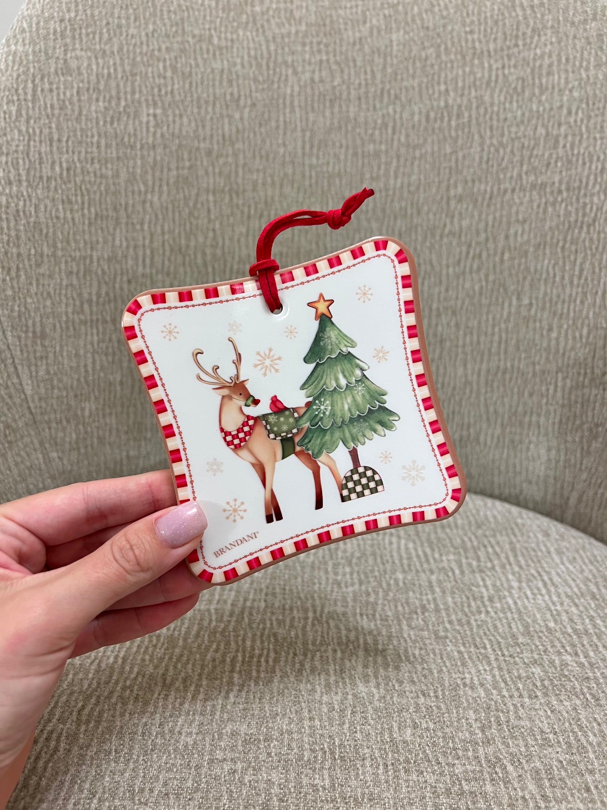 La collezione "Racconti" firmata Brandani accoglie le feste con armonia, eleganza e gioiosità! Il sottotazza Racconti, realizzato in ceramica con pratica cordicella rossa, è perfetta per adornare i tuoi spazi: appendilo dove vuoi o usalo per decorare la tua tavola proteggendone la superficie grazie al retro in sughero.